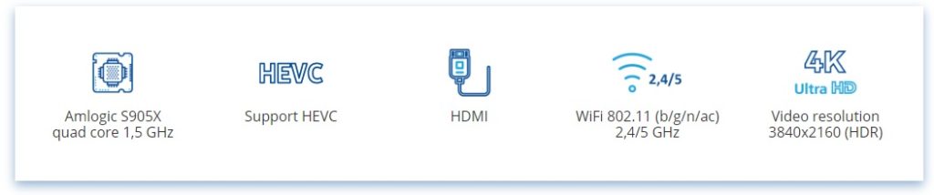 • Interfaces: HDMI, AV, Ethernet, 2xUSB, MicroSD Card, ext.IR, Wi-Fi 802.11